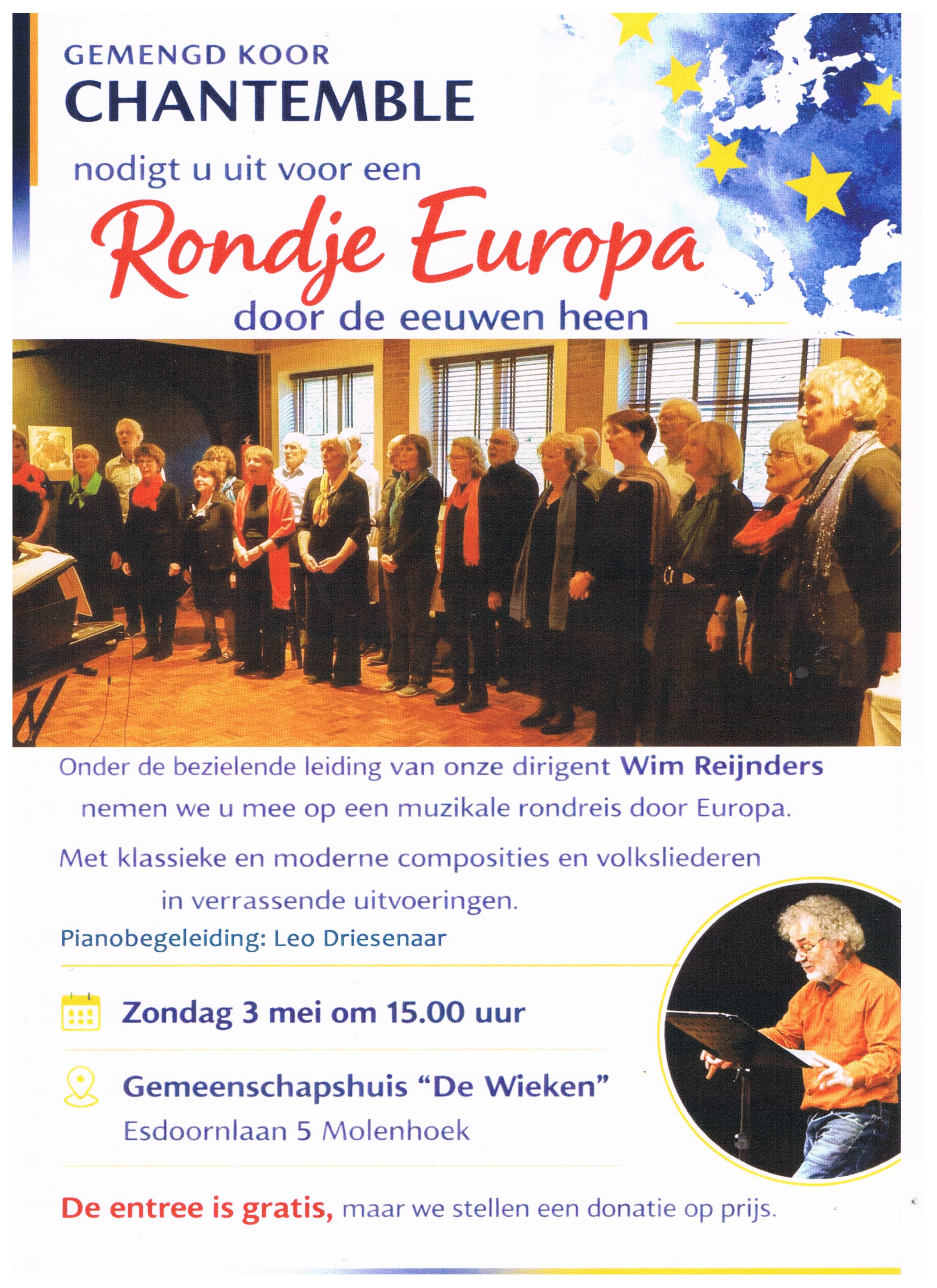 Op zondag 3 mei zingt Gemengd koor Chantemble voor u, in de Wieken, Europese liederen van de afgelopen eeuwen.